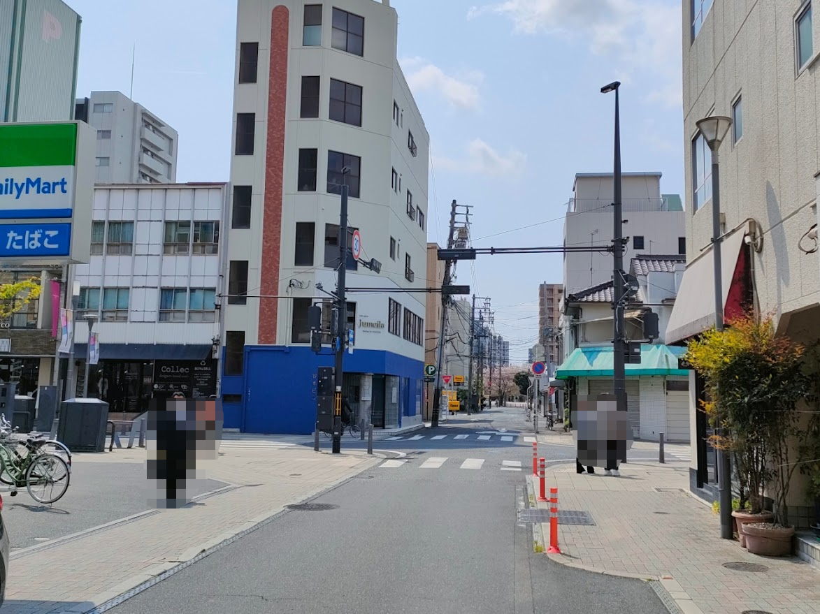 お店の向かいには「ファミリーマート 錦町東店」があり、南方向には「ハレまち通り」が見えます。